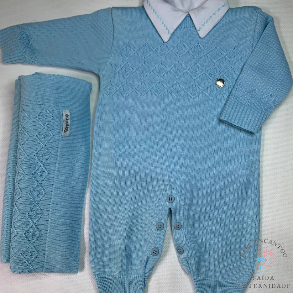 Macacão e Manta: Tricot com fio antialérgico para conforto e calor.