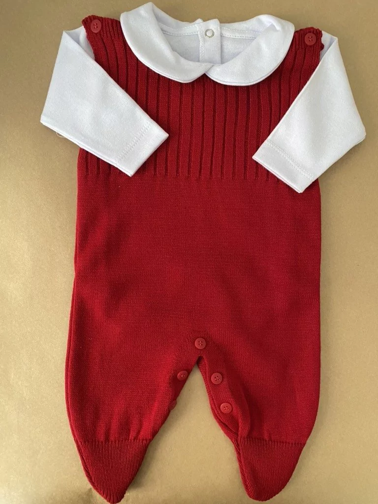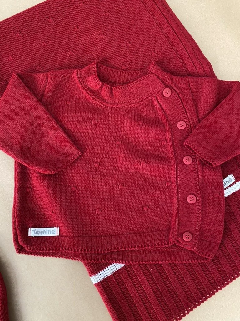 Dê as boas-vindas ao seu recém-nascido com estilo e conforto com o nosso Kit Saída de Maternidade em Tricot Happy Baby na cor vermelha, tamanho P (0 a 3 meses).