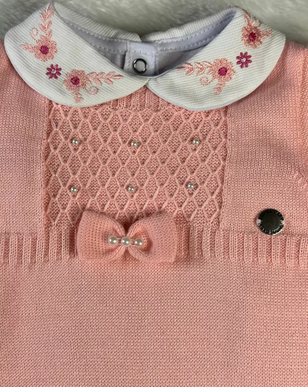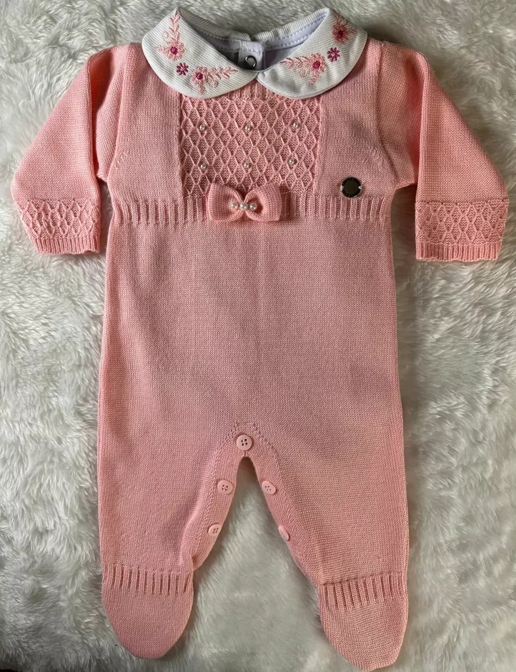 - 1 Macacão com pézinho, detalhes em pérolas, laço bordado e mangas trabalhadas